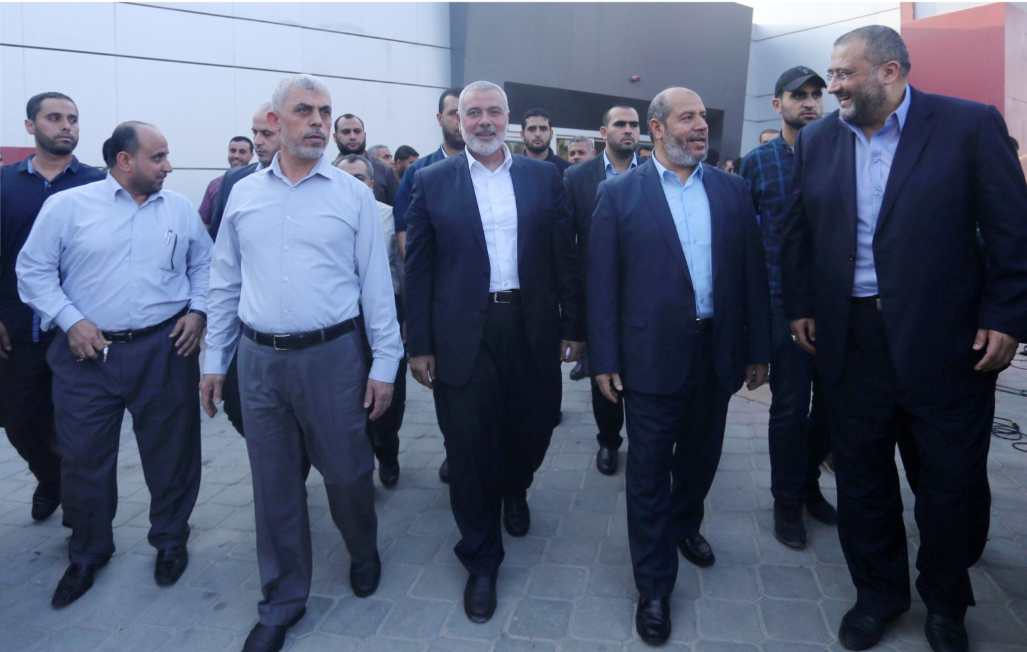 야히야 신와르(왼쪽), 이스마일 하니예(가운데), 그리고 칼릴 알하야(오른쪽)가 2017년 9월 19일, 팔레스타인 통합 정부를 맞이하기 위해 라파 국경의 팔레스타인 측에 도착하고 있다. 출처: Yasser Qudih/APA Images