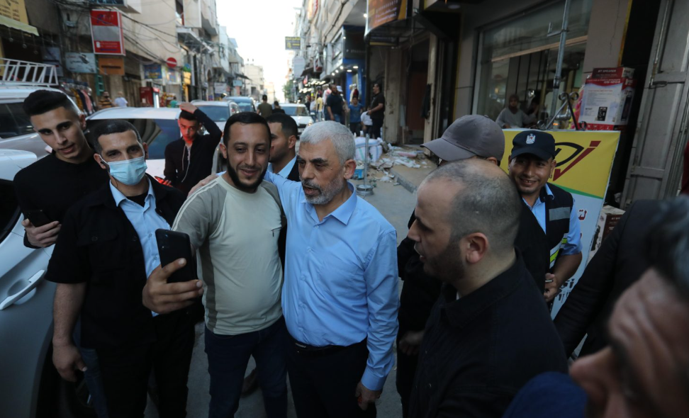 야히야 신와르가 지지자들과 함께 2021년 5월 26일 가자시티의 알리말 지역을 순회하고 있다. 출처: Ashraf Amra/APA Images