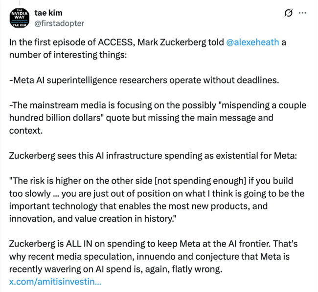 저커버그는 메타를 AI 최전선에 유지하기 위해 투자에 올인하고 있다. 그렇기 때문에 최근 언론의 추측, 억측, 그리고 메타가 AI 투자에서 흔들리고 있다는 주장들은 명백히 틀린 것이다.