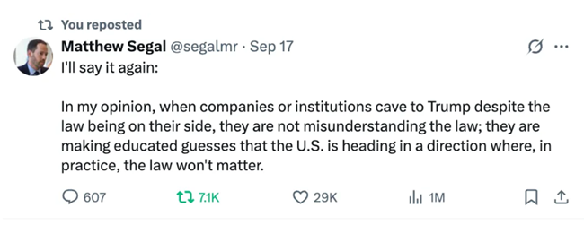 내 생각에, 기업이나 기관들이 법이 자기들 편임에도 트럼프에게 굴복할 때, 그것은 법을 잘못 이해해서가 아니다. 그들은 사실상 미국이 법이 중요하지 않게 될 방향으로 가고 있다고 판단해 그렇게 행동하는 것이다.