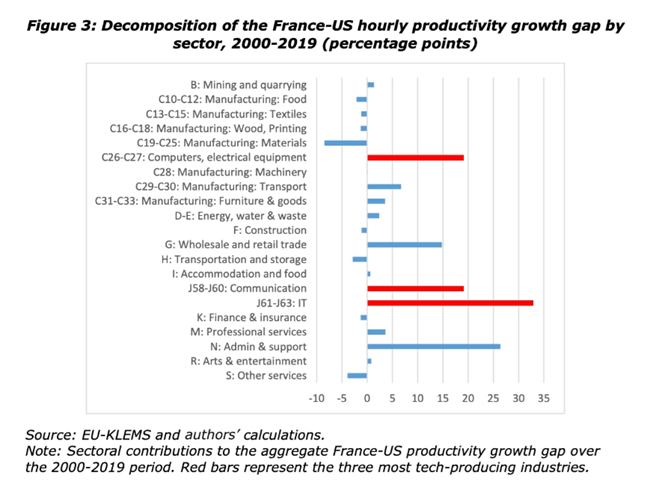 부문별 프랑스–미국 시간당 노동생산성 성장 격차의 분해, 2000~2019년 (퍼센트포인트) 출처: 프랑스 중앙은행