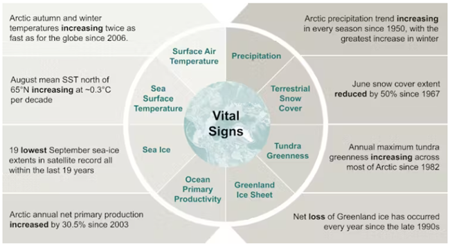 오늘날 눈이 쌓여 있는 기간은 극적으로 짧아졌고해빙은 더 얇아지며 더 이르게 녹고 있다산불 시즌은 갈수록 악화하고 있다증가하는 해양 열은 비()북극 해양 종들이 북쪽으로 이동하면서 생태계를 재편하고 있다해빙되는 영구동토층은 철과 기타 광물을 강으로 방출해 식수 수질을 악화시키고 있다그리고 따뜻해진 바다에 의해 강화된 극단적 폭풍은 지역 공동체를 위험에 빠뜨리고 있다.