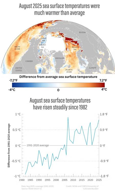 북극해의 표층 수온은 꾸준히 상승하고 있으며, 2025년 8월의 수온은 관측 사상 가장 높은 수준 가운데 하나였다대서양 구역의 일부 지역에서는 해수면 온도가 1991~2020년 평균보다 화씨 13섭씨 7.2도까지 높았다반면 추크치해와 보퍼트해의 일부 지역은 평년보다 더 서늘했다.
