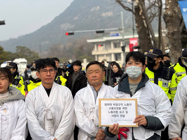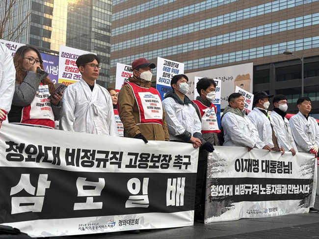 이성윤 공공운수노조 서울지부 지부장은 “이재명 대통령은 정부가 모범적 사용자의 모습을 보여야 한다고 했으니, 대통령이 이 문제를 직접 챙겨라”고 목소리 높였다. 김진억 민주노총 서울본부 본부장도 “청와대 복귀가 공공성 회복을 의미한다면, 그 출발은 가장 취약한 위치에 있는 노동자들의 고용을 지키는 것”이라고 말했다.