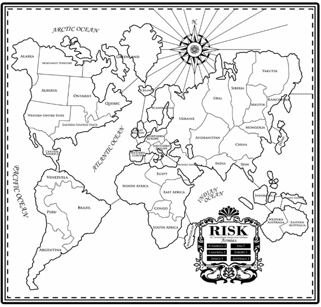보드게임 〈리스크(Risk)〉의 세계 지도판. RISK: The Game of Global Domination. 세계 지배 게임