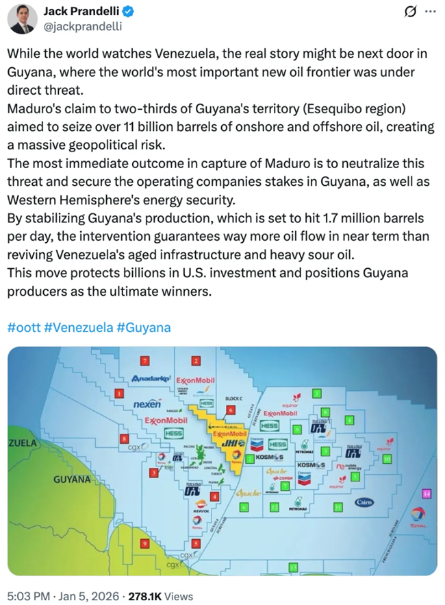 결국 핵심 변수는 가이아나가 될 가능성이 크다. 마두로를 제거하면, 그곳에서 이루어진 거대한 신규 석유 발견을 위협할 만한 요인이 사라지게 된다.