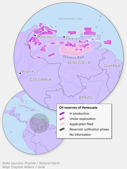 문제가 된 이 땅에는 전 세계에서 확인된 최대 규모의 석유 매장량이 들어 있다. 약 3천억 배럴로, 전 세계 매장량의 약 17%에 해당한다. 그러나 수년간의 정치적 혼란과 미국의 제재 이후, 베네수엘라는 전 세계 원유 생산에서 차지하는 비중이 고작 1퍼센트에 불과한 상태다. 브루킹스연구소의 에너지 안보 및 기후 이니셔티브 책임자인 서맨사 그로스는 이렇게 말했다. “석유가 거기 있다는 사실 자체는 분명하다. 하지만 지상에서 감수해야 할 위험은 엄청나게 크다.”
