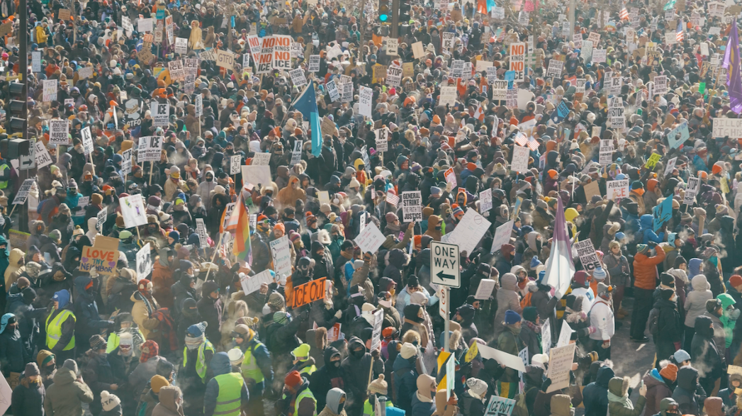1월 23일 미네소타주 미니애폴리스 도심에는 총파업에 참여한 10만 명이 넘는 사람들이 운집했다. 사진: 마야 라이트