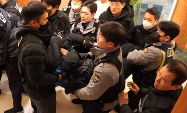 대통령의 경남 타운홀미팅 나흘 전인 2월 2일 경찰이 서울 세종호텔에서 고진수 지부장을 연행하고 있다. 출처: 세종호텔 정리해고 철회를 위한 공동대책위원회