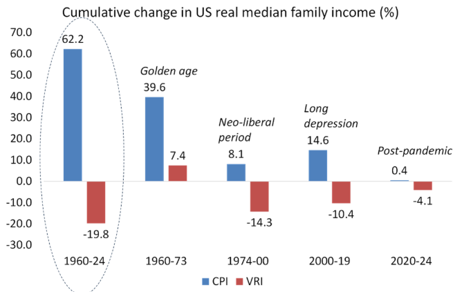 공식 소비자물가 상승률은 2025년 내내 둔화했지만여러 연구는 미국의 공식 소비자물가 지표가 실제보다 낮게 산정된다고 지적한다한 연구는 모기지와 금융 비용을 공식 지수에서 제외한다고 밝혔다이를 포함하면 물가 상승률은 두 배가 된다나는 이전 글에서 공식 지수가 미국 가계가 체감하는 실제 물가 상승을 반영하지 못한다고 지적했다우리가 개발한 가치 기준 인플레이션율을 적용하면가계 실질소득은 1960년 이후 약 20%, 팬데믹 이후 4% 감소한 것으로 나타난다.