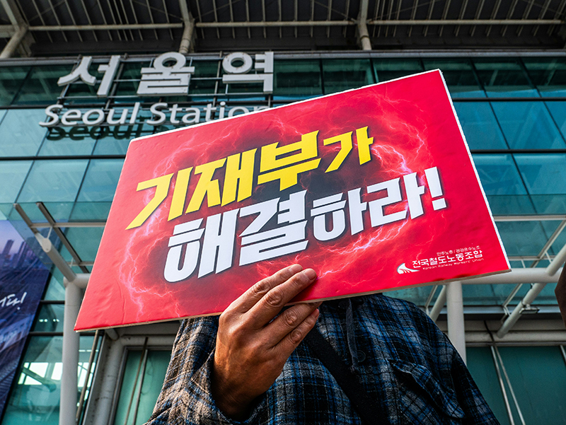 2024년 철도노조 총파업 예고 기자회견 참여자가 피켓을 들어보이고 있다. 참세상 박도형 기자.