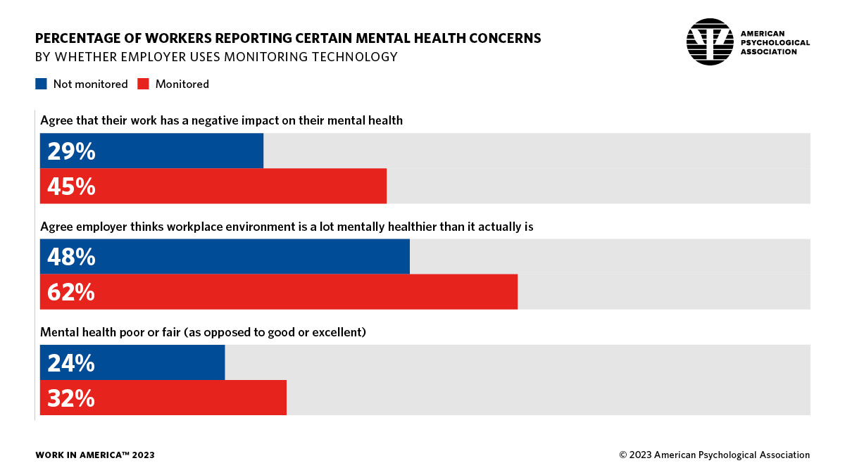 미국심리학회(APA)의 ‘2023년 미국 내 노동 조사’(Work in America 2023) 결과보고서를 봐도, ‘근무 환경이 정신 건강에 부정적인 영향을 미치는지’에 대한 질문에 감시받는 노동자(45%)가 감시받지 않는 노동자(29%)보다 더 ‘그렇다’고 응답한 비율이 높았다.