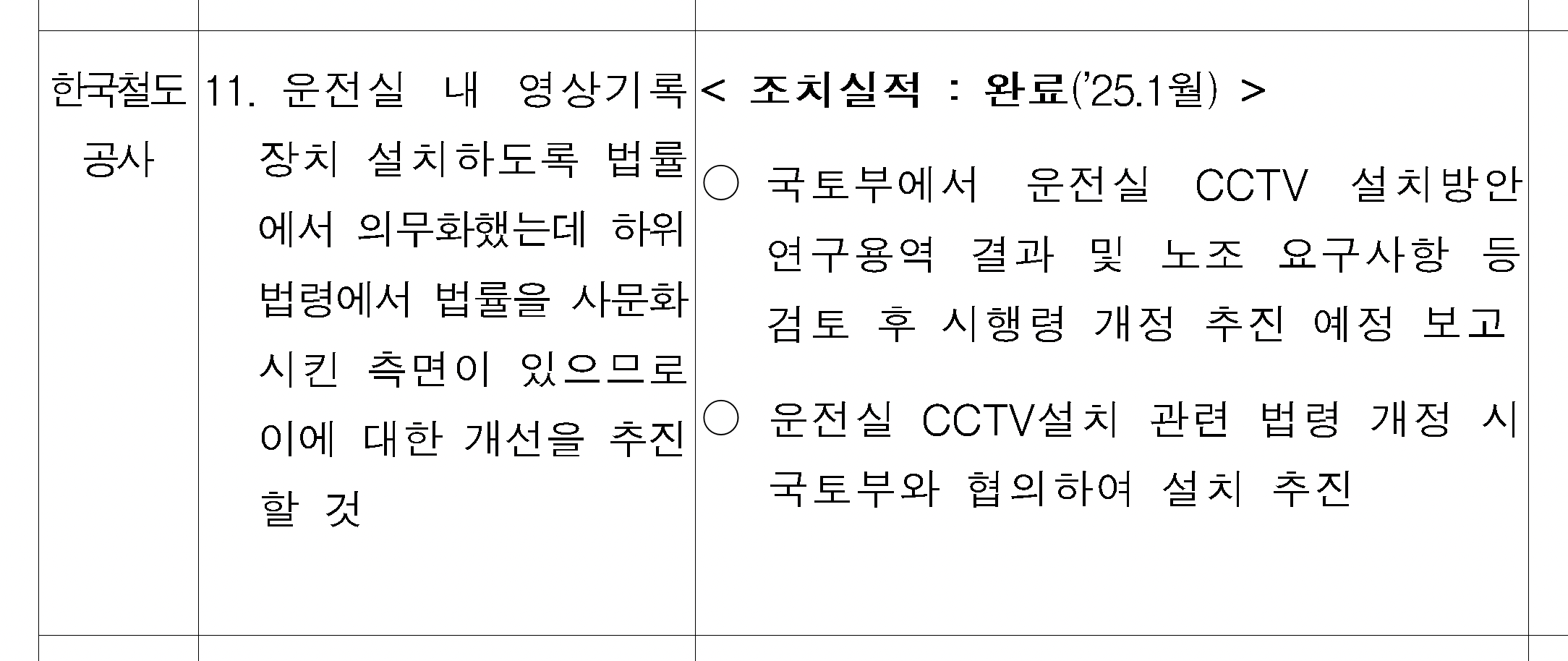 2025년 1월 한국철도공사가 공공기관 경영정보 공개시스템에 공시한 ‘2024년도 국정감사 지적사항 조치결과 및 향후계획’에는 시행령과 법령을 개정해서라도 운전실 CCTV 설치를 추진하겠다는 내용이 담겼다. 이는 윤재옥 국민의힘 의원이 오봉역 사고가 기관사의 휴대전화 사용 때문이라며, 국정감사 지적사항으로 운전실 CCTV 운영을 촉구한 데 따른 조치다.