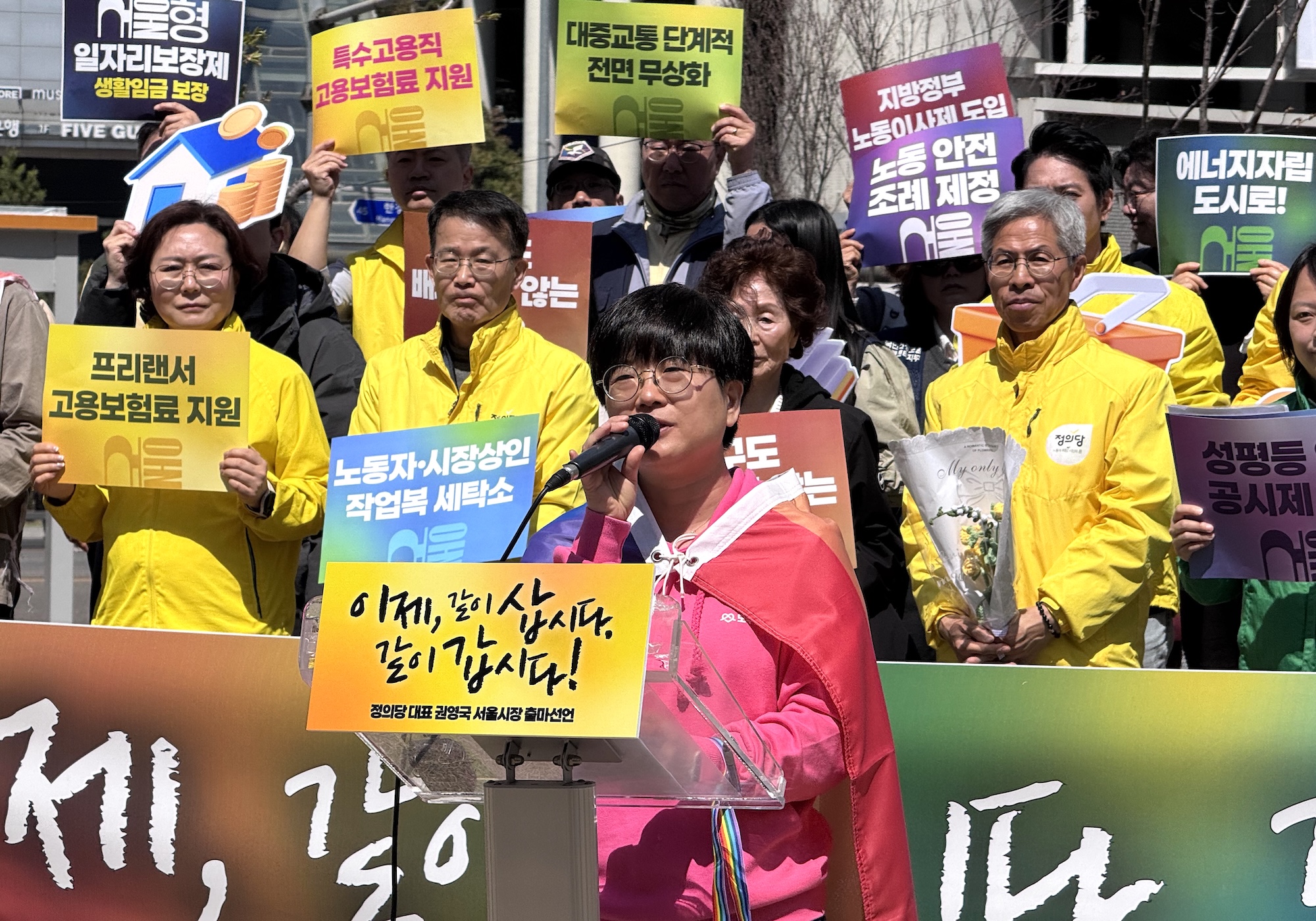 서울시사회서비스원 해고 노동자인 오대희 민주노총 공공운수노조 서울시사회서비스원 지부장은 “정확히 5년 전 4월 8일 오늘, 서울시장이 바뀌고 우리 동료 노동자들에게는 악몽 같은 시간이 시작됐다”면서 오세훈 시장은 서울시의 유일한 공공돌봄 기관인 서울시 사회서비스원을 졸속 해산시켰고 400여 명의 돌봄 노동자들을 집단 해고했다고 환기했다. 그는 “민주당이 과반 의석으로도 제대로 된 사회서비스업법 하나 지키지 못하고 국민의 힘이 해산을 주도할 때 우리와 함께 비를 맞았던 사람이 바로 권영국 후보”라며 권 후보와 함께 “누구나 보편적인 돌봄을 누리고 돌봄 노동자가 전문가로서 대우 받는 서울”을 함께 꿈꾸고 실현하겠다고 말했다.