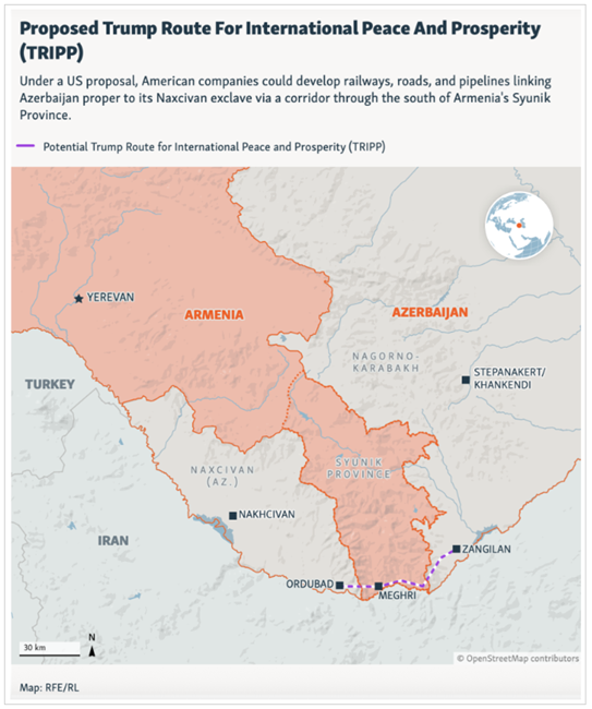 남캅카스에서 미국은 TRIPP 프로젝트(국제 평화와 번영을 위한 트럼프 경로)를 지지해 왔으며, 이 프로젝트는 아르메니아를 통해 아제르바이잔 본토와 자치 영토 나흐츠반을 연결하고, 아시아에서 출발한 상품이 유럽에 도달할 수 있도록 한다.