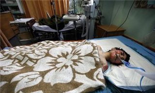 20살의 팔레스타인인 살리 사크리. 장애가 있었던 그녀는 지금 가자 시파 병원 침대에 누어있다. 산소호흡기 아래로 보이는 그의 뺨은 폭격에 타 ...