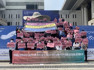 공공운수노조 소속 500여 명의 노동자들이 세계노동절을 맞아 코로나19 상황에서 모든 해고를 금지하라는 공동행동을 벌였다.