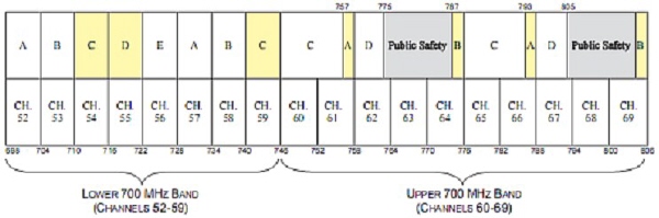 이번에 경매된 698~806MHz 주파수 대역. 노란 부분은 이미 예전에 경매된 부분이고 회색 부분은 전국적인 공공 안전 광대역 네트워크를 위해 보유된 공간이다. 나머지 흰 부분들(A, B, C, D, E)이 이번에 경매된 부분이다. 사진 출처: FCC, ars technica에서 재인용