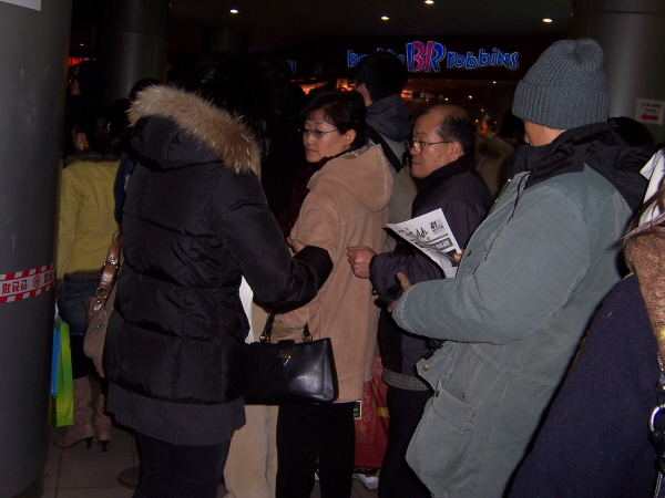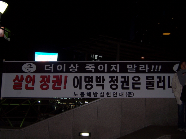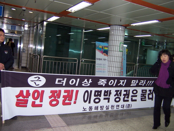 어제 해방연대 회원들은 추모대회와 설 귀향의 시작을 기해 시청역과 서울역에서 선전전을 진행했습니다. “학살정권, 이명박 정권은 물러나라!”는 제목이 큼지막하게 찍힌 <사회주의 정치신문 해방> 용산참사 특별호를 사람들에게 배포했습니다.