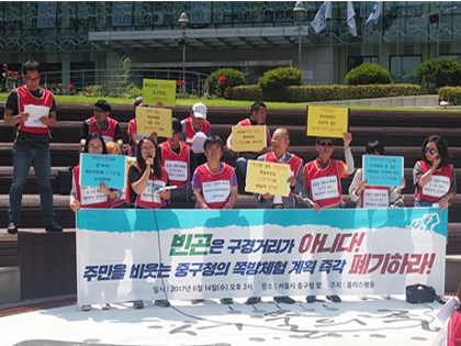 ▲ 지난 6월 14일 오후 2시, 중구청 앞에서 홈리스행동, 빈곤사회연대, 동자동사랑방, 인권운동사랑방 등의 반빈곤·인권단체가 모여 가난을 상품화하는 중구청을 규탄하는 기자회견을 열었다. |