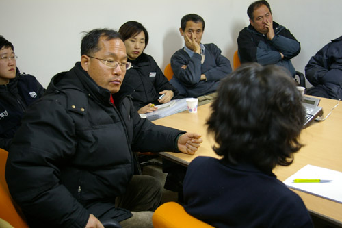 7일 오전 9시 40분, 국회 앞에서 비정규직법안 날치기 강행 저지를 위해 농성중이던 노동자들이 열린우리당 당의장에 출마한 정동영, 김근태 후보 선거대책본부 사무실 두 곳을 찾아가 면담을 요청하며 농성을 전개하고 있다.