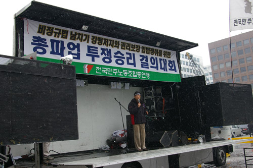 민주노총은 7~9일 열리는 국회 환경노동위원회에서 비정규 관련 법안이 통과되는 것을 저지하기 위해 7일 오전 10시 국회 앞에서 ‘비정규법 날치기 강행 저지와 권리보장 입법 쟁취를 위한 총파업 투쟁승리 결의대회’를 열었다. 집회에 모인 300여 명의 노동자들은 “날치기 강행처리 총파업으로 박살내자”고 목소리를 모았다. 집회 참가자들은 눈발이 휘날리는 가운데 땅이 젖어 앉지도 못한 채 집회 진행했지만 “비정규직 반드시 철폐하자”며 힘차게 결의를 모았다.