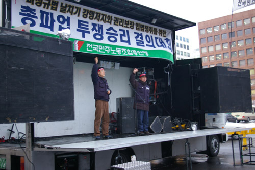 집회에서는 오늘 진행된 투쟁에 대한 평가가 이어졌다. 연대사로 나선 이해삼 민주노동당 최고위원은 “이제 더 많은 조합원들, 노동자들을 조직해서 무얼 제어하거나 저지하는 투쟁이 아니라 국회를 민중의 것으로 만드는 투쟁을 하자”며 참가자들을 독려했다.