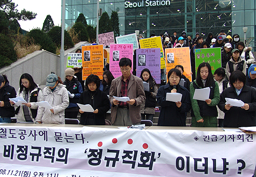 이들은 기자회견문을 통해 "철도공사와 외주위탁사의 KTX관광레저와의 위탁협약 내용을 보면 간접고용 정규직의 실체가 얼마나 허구적인가를 알 수 있다"며 "새마을호 승무원 외주화 방침은 '위장된 고용'의 전형적인 사례"라고 지적했다.