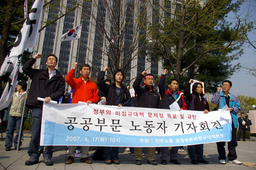 이에 17일, 정부종합청사 앞에서는 공공기관에서 일하는 노동자들이 정부의 비정규 대책이 “비정규 확산의 주범”이라고 지적하고 나섰다. 기자회견에는 철도노조 KTX 승무지부, 새마을호 승무원, 전국평생교육노조, 전국공공연구노동조합, 공공노조 의료연대지부, 보건의료노조, 민주노동당 등 공공부문 노동자들이 대거 참여해 정부 대책의 문제점을 지적했다.