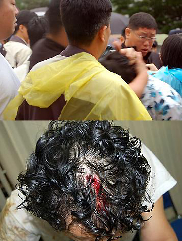 ▲ 위-대우차 비정규직노동자 폭행장면 카메라에 포착 아래-이날 상황을 촬영하던 최영준 활동가의 머리가 사측의 집단구타로 찢어지는 부상을 입었다. [출처: 전국미디어운동네트워크] |