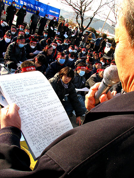 결의대회에서 길준영 지회장은“2000년도에 같이 일하던 동료가 빠레뜨에 깔려 죽었을 때도, 유가족이 공장 앞에서 제사라도 지내게 해달라고 사장한테 간청하다가 거부됐을 때도 우린 아무 말도 할 수 없었다”며 “우리도 사람 대접받아가며 일해보기 위해 10월 13일 노조를 설립했다”고 말해 참가자들의 박수가 터져 나오기도 했다.