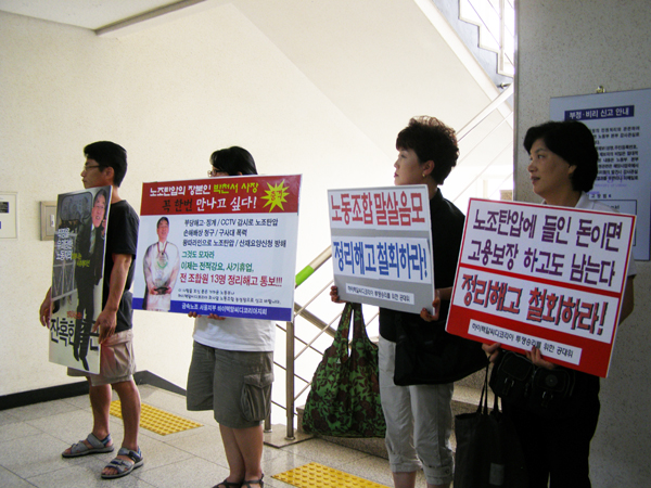 상황을 듣고 4층으로 올라온 노사지원과 직원 2명은 조합원들에게 찾아온 이유를 묻기 보다는 “노사지원과 거쳐서 와도 되지 않느냐? 왜 이 곳으로 바로 올라왔냐”고 물었다. 이에 조합원들은 “우리는 이미 수도 없이 노사지원과를 거쳤다. 사측에서 노조 탄압한다는 사실을 말하러 와도 노사지원과가 뭘 어떻게 했냐? 정리해고 통보된 것 노동부는 알고 있지 않냐? 관할 담당 지역에서 불법 해고가 일어나도 휴가만 가면 다냐”고 되물었다.