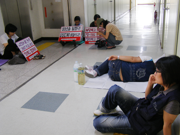 그러나 지청장과 담당 감독관은 휴가중이었다. 조합원들은 “지청장 휴가가 오늘 까지라니까 내일은 나오지 않겠어? 오늘 복도에서 잠을 자더라도 기다렸다 만나겠다”며 지청장실 입구 쪽 복도에 하나 둘 자리를 잡고 앉았다. 이를 지켜보던 노동청 직원은 “아무 연락도 없이 이렇게 오면 어떻게 하냐. 우리도 휴가를 이번 달에 잡은 게 아니라 몇 달 전부터 잡아온 것이다. 그렇다고 휴가 간 사람을 불러올 수도 없지 않느냐”고 난처한 입장이라고 설명했다.
