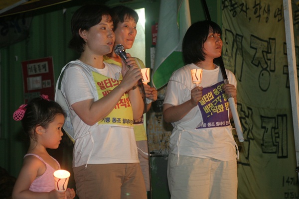 ▲ 기륭분회 촛불문화제에 참석한 '82cook.com'회원들이 자유발언을 통해 기륭분회 조합원들에게 연대의 뜻을 전하고 있다. |