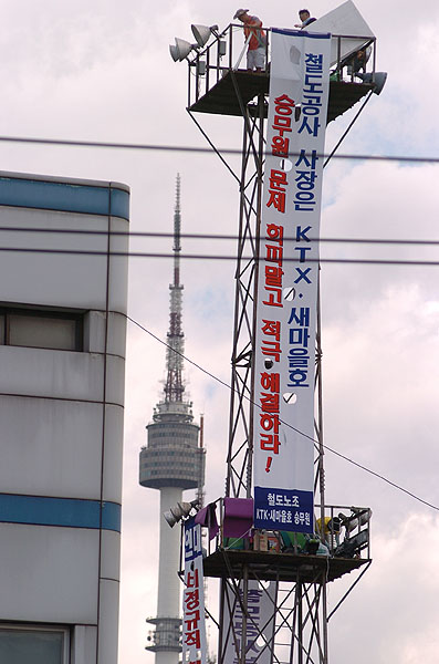 또 KTX와 새마을호를 이용하는 승객들을 향해 "여러분들이 서울역 홈에서 열차를 타고 계실때 맞은편 조명철탑 위에서 농성하는 승무원들이 보일 것"이라며 "3년 가까이 처절하게 짓밟히고 저항해 온 승무원들이 자신들의 생존권과 함께 40미터 철탑 끝으로 올라갔다는 사실을 기억해 주시기 바란다"고 호소했다.