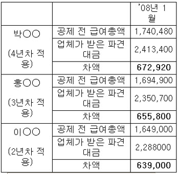 ▲ 파견업체와 강남성모병원 사이에 맺은 계약서에서는 파견업체가 파견직 노동자들에게 돌아가야 할 임금 중 5-70만 원을 떼어간 것도 드러났다. |