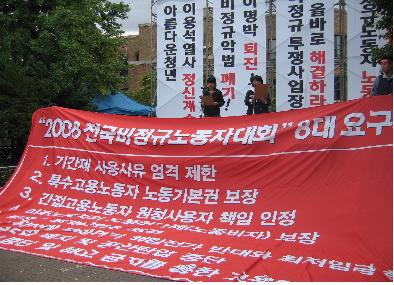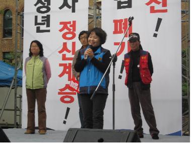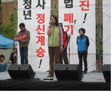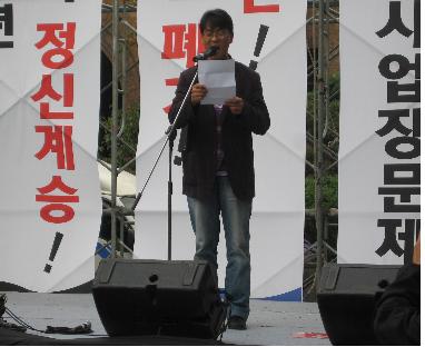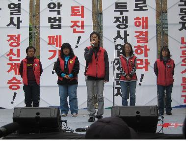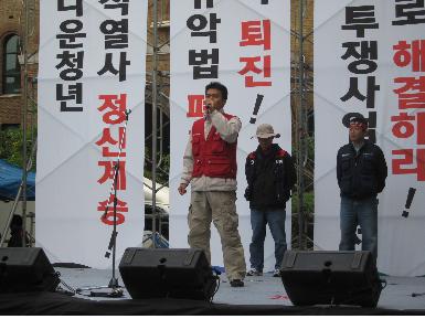 기아 자동차 ‘모닝’을 만든다는 동희 오토에서 나온 조합원. (내가 기억하기로 동희오토 해복투 이XX 조합원이었던 것 같은데 영 확실하지가 않아서 이름까지는 숨겨둔다.) 구사대가 휘두른 폭력 때문에 많은 조합원들이 다쳤다고 했다. 생산 라인에서 일하는 노동자들 모두가 비정규직이라는 것이 동희 오토의 현실이란다.