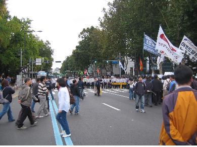 보신각까지 행진해 가기 위해 도로로 나오는 사람들. 저 앞에 늘어서 있는 경찰들이 보인다. 어청수 경찰청장이 단 한 개 차선으로만 대오가 행진하게 하라는 특별 지시를 내렸다고 했다. 전국비정규직노동자대회 참여자들이 조금이라도 더 적어 보이기를 바란 꼼수였을까? 하여튼 이해할 수가 없었다.