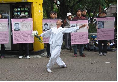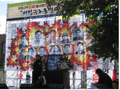 국화 꽃무더기를 그러쥐고 열사를 추모하는 행위 예술을 벌이고 있는 이름 모를 분. 뒤쪽에 사람들이 하나씩 들고 있는 피켓은 그동안 비정규직 투쟁 현장에서 목숨을 잃은 열사들.