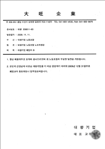 대왕기업은 11일 밤 9시경 현 대왕기업 노조위원장 유영애 씨에게 업체 폐업 공문을 전달한 것으로 알려졌으며, 업체 폐업 근거가 특이하게도 대왕기업 고00 사장이 “본인의 건강상의 이유로 운영이 어렵다.”고 설명하고 있다.