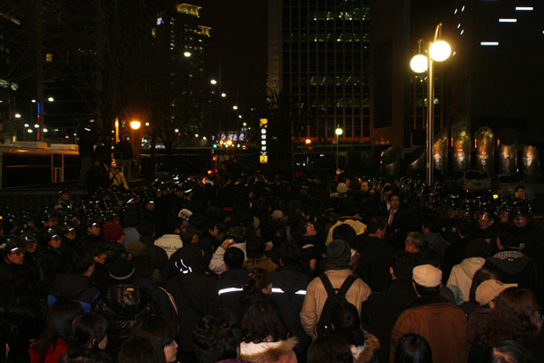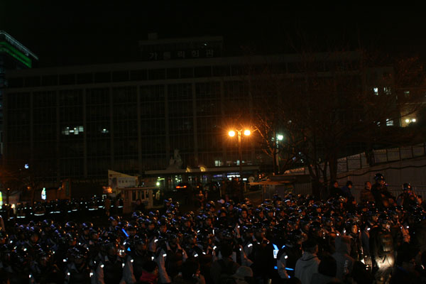 경찰은 살수차를 배치해 놓고 두 차례 해산 경고방송을 내보냈으나 전의경들이 도로 행진을 차단하고 있어 마찰은 빚어지지 않았다. 밤 11시를 지나며 집회 참가자들이 2백여 명으로 줄었을 즈음 명동 하나은행 앞쪽에서 20대 남성 한 명이 한때 연행돼 소동이 빚어졌다.