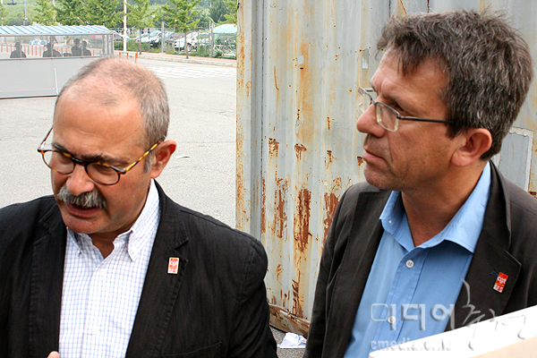 경찰해 의해 출입을 제지당한 채, 쌍용차 노동자들과 인사를 나누던 크리스티앙 필로쵸스키 국제부장, 자비엘 페트라치 남서지역 지부장을 만나 간단한 대화를 나눴다.