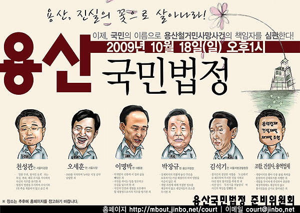 ‘용산 철거민 사망사건 국민법정 준비위원회’는 14일(월) 용산참사가 난 남일당 옆 레아호프에서 국민법정 준비위 발족 선포 기자회견을 열고 △국민법정 준비 경과 및 취지 △기소할 주요 법리 △1만 기소인 모집 캠페인 계획 등을 발표했다.