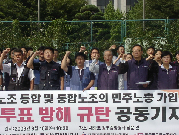 민주노총과 3개 공무원 노동조합들은 16일 오전 서울 세종로 정부종합청사 앞에서 기자회견을 갖고 “정부가 벌이고 있는 모든 형태의 지배개입과 부당노동행위를 중단하라”고 촉구했다.