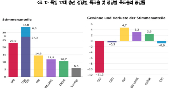 ▲ Stimmenanteile: 득표율, Gewinne und Verluste der Stimmenanteile: 득표율의 증가 및 손실 *SPD: 사회민주당, CDU:기독민주연합, CSU: 기독사회연합, FDP:자유민주당, DIE LINKE: 좌파당, GRÜNE: 녹색당, Sonstige: 그외 |