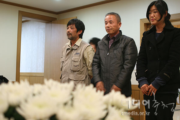 ▲ 반도체 노동자의 건강과 인권지킴이 반올림에 소속되어 삼성반도체의 실상을 알리고자 했던 이들이 박지연 씨 빈소 앞에 섰다. 왼쪽부터 김성환 삼성일반노조 위원장, 황상기 씨, 이종란 노무사. |