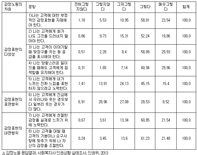 감정표현의 내면행위는 노동자 스스로 진심으로 친절한 감정을 고객에게 표현하기 위해 일종의 자기 최면이나 내면적인 노력이 상당히 필요함을 의미하는데, 사회복지사들은 82.4%와 82.7%(7,8번 문항)로 높게 나타났다.