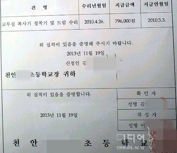 00초등학교 측도 김 씨가 복사기 정착기와 드럼을 수리했고, 79만6천원을 지급했다는 내용 증명을 19일 발급해줬다.