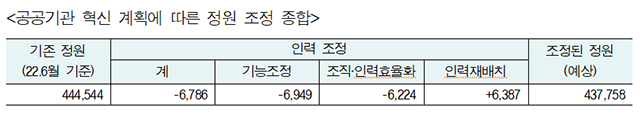 공공운수노조가 정부의 '공공기관 혁신 가이드라인'에 따른 공공기관 기능조정, 조직·인력 효율화, 인력 재배치 계획을 분석한 결과에 따르면, 인력 감축 규모는 현재까지 6,786명이다. 이는 전체 정원(2022년 6월 기준 44만4,544명)의 1.5% 수준이다. 정원 감축이 이뤄지는 기관 수는 228개로, 전체(370곳·부설 기관 포함)의 61.6%를 차지한다. 이 규모는 기획재정부의 추가 감축 요구로 더욱 커질 전망이다.