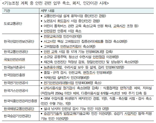 실제 노조가 기능조정 계획 중 안전 관련 업무 축소·폐지·민간이관 사례를 정리한 자료에서는 △한국산업안전보건공단, 사고사망 핵심 고위험요인 집중관리(패트롤 점검) 축소(28명)·고위험업종 안전보건지킴이 축소(9명) △한국전기안전공사, 전기안전관리대행사업 민영화(398명 축소) △한국가스안전공사, LPG사용시설 정기검사 축소(35명 감축) 등의 계획을 확인할 수 있었다.